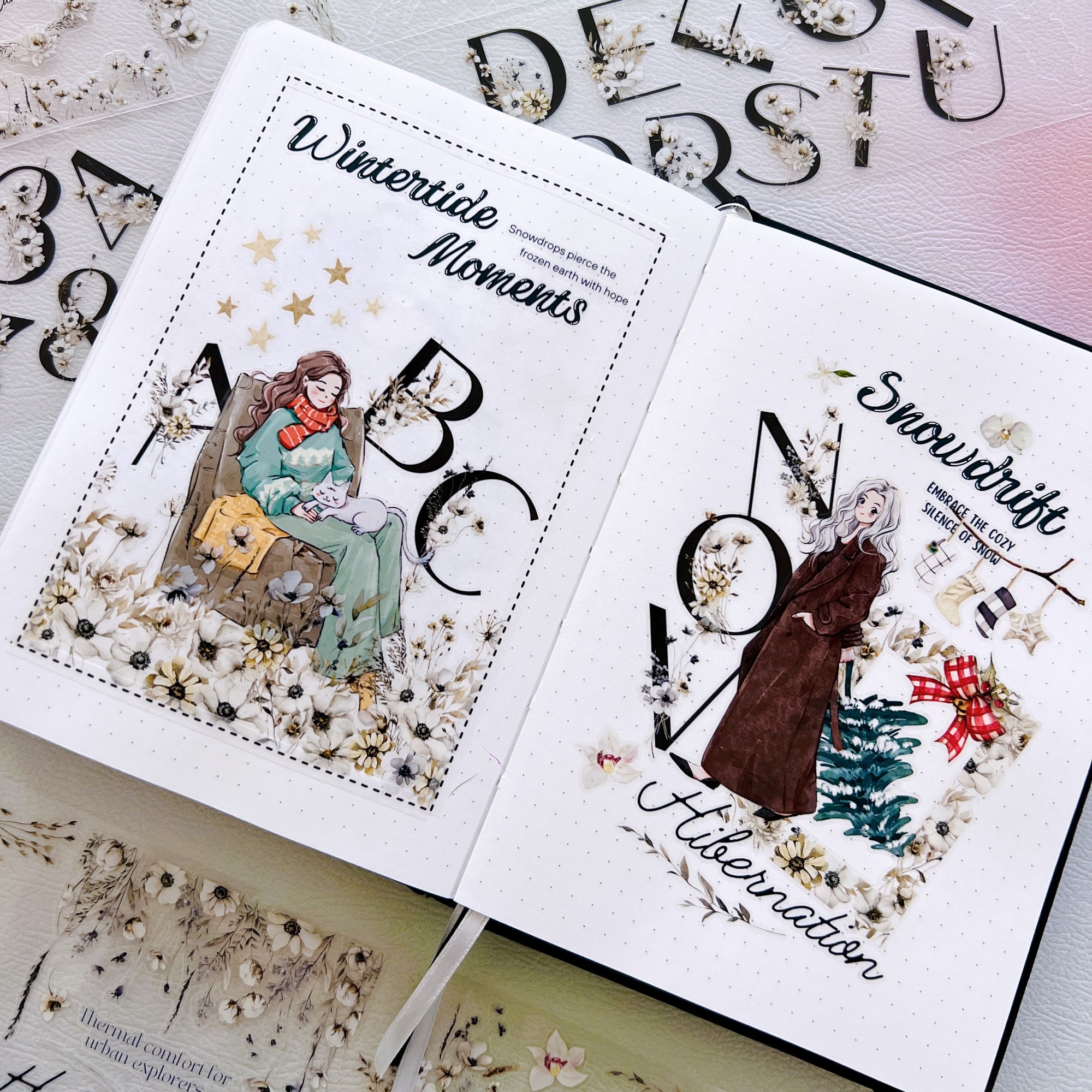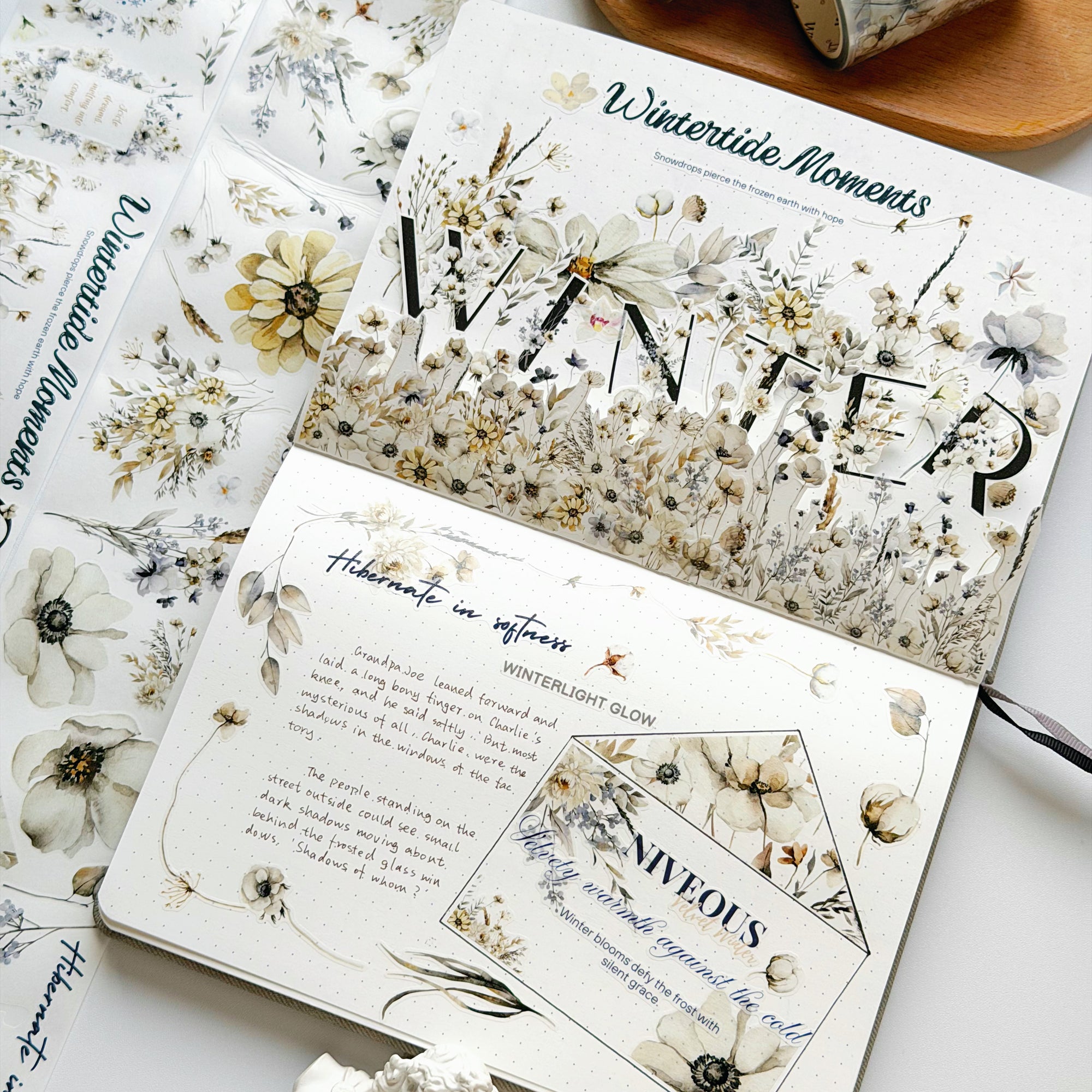 The quiet beauty of winter meets the romance of handwritten notes in our Frosted Letters Pre-cut Wide Washi/PET Tape. Soft white florals blend seamlessly with gentle script quotes, giving each sticker a storybook feel—like finding a love letter tucked between snow-covered leaves. Pre-cut for effortless layering, these dreamy touches are perfect for December journaling, memory keeping, and creating calming, reflective winter layouts.