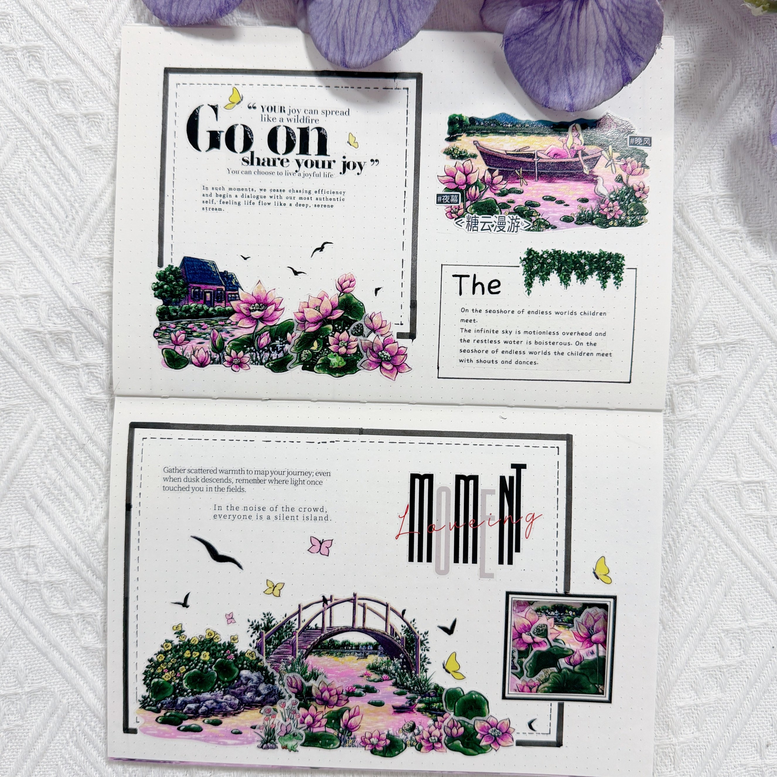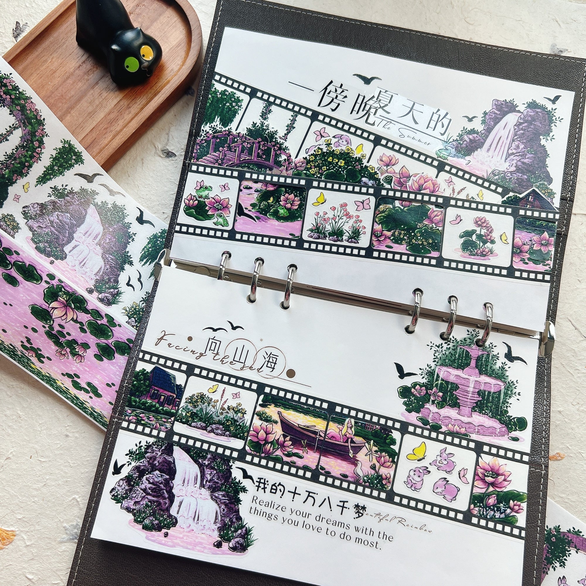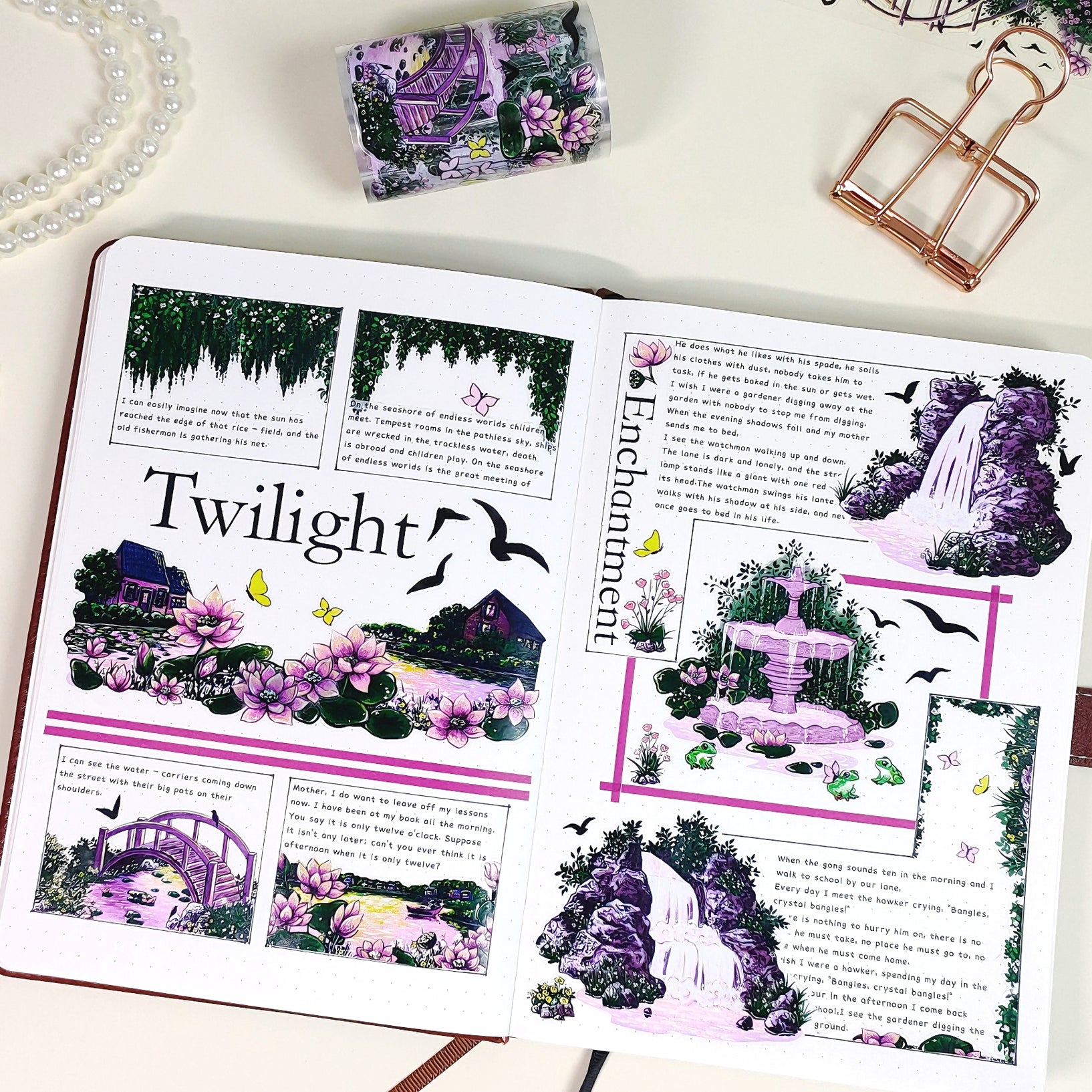 Build a world bathed in twilight magic with the Pre-cut Lotus Saga Wide Washi/PET Tape. As the sun sets, it casts a rosy spell over the entire garden, and this tape captures that exact moment of enchantment. We have taken intricate illustrations of stone bridges, cascading waterfalls, majestic arches, and bubbling fountains, and washed them all in the soft, warm pinks of the evening sky. These aren't just stickers; they are pieces of a dreamscape. Peel and place these glowing architectural gems alongside the blooming lotuses to create a sanctuary that feels warm, peaceful, and utterly magical.