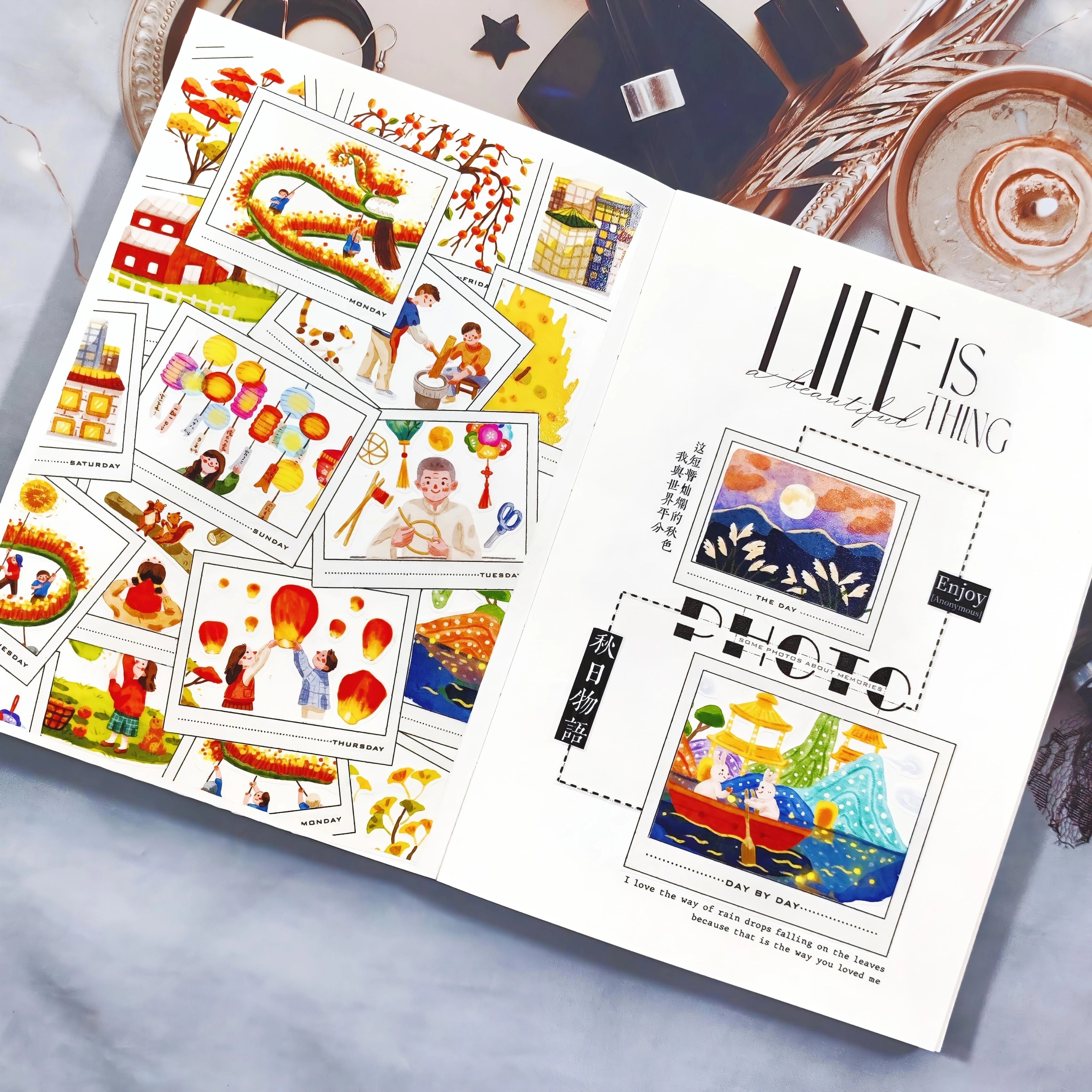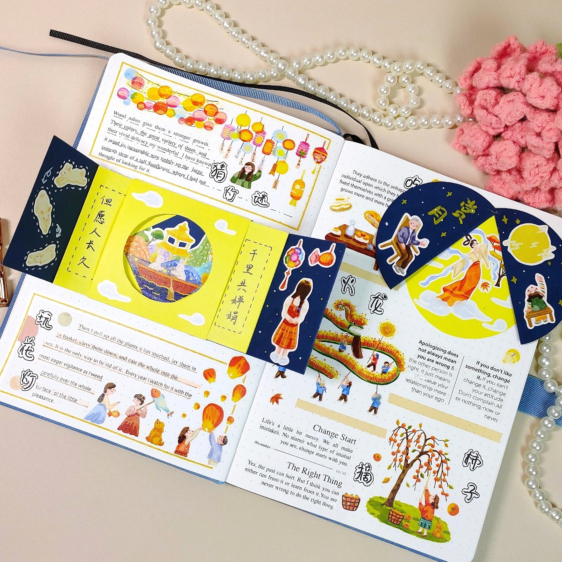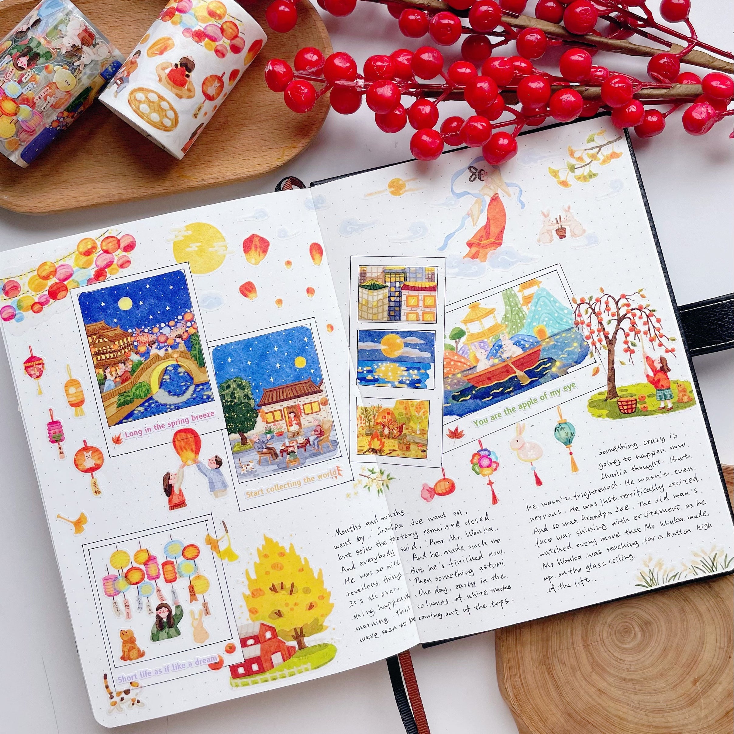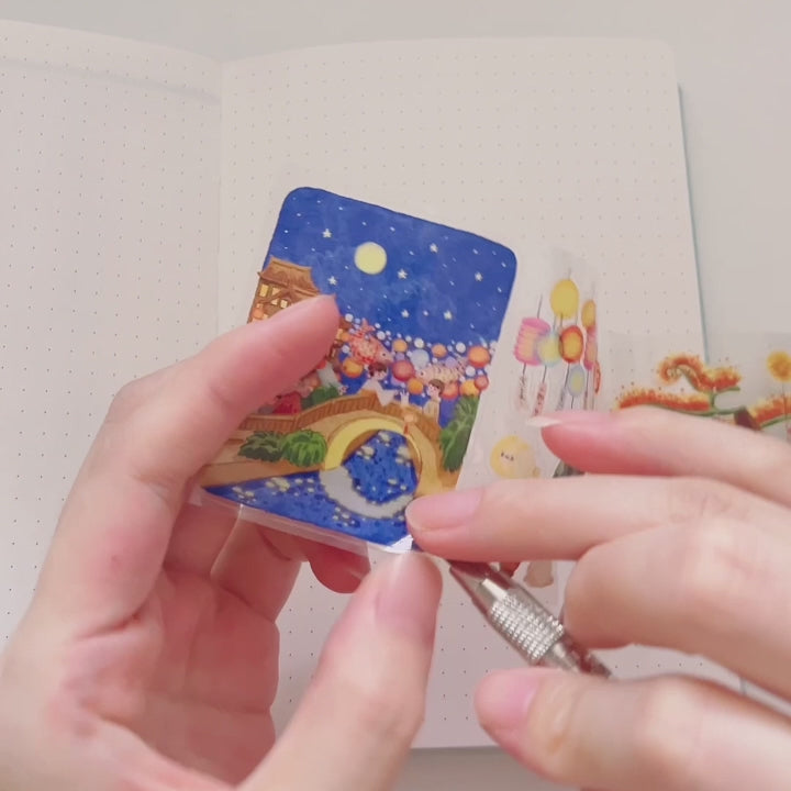 Celebrate the glow of the Mid-Autumn moon with this Pre-cut Moon Festival Wide Washi/PET Tape. Featuring delicate hand-drawn lanterns, mooncakes, rabbits, and night skies, each scene captures the warmth of family gatherings and the beauty of tradition. Pre-cut for effortless use, this tape is perfect for journaling, scrapbooking, and bringing a touch of festival magic to your pages.